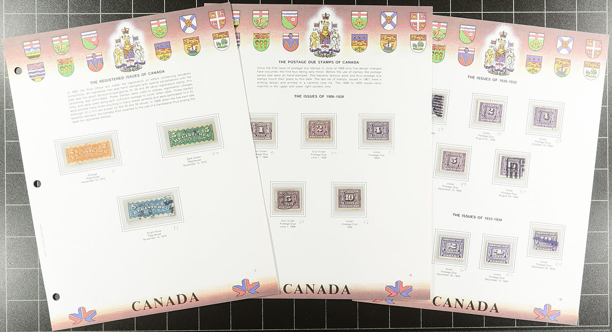 A used, and quite complete, collection of used "back of the book" Canada, plus a stamp or two from the three Maritime colonies, plus a collection of about 100 different Newfoundland stamps. Most are clean examples with respectable cancels. Includes all the Montreal Olympic semi-postals, and an example of each of the airmail and special delivery issues. The Registration trio is there, including the 8c #F3, and a basic offering of both purple and red postage dues. The Officials include a light offering of 4-hole OHMS, and a hit-or-miss group of "OHMS" and "G" overprints (did see the $ Peace and $ Fisheries with "G" overprints). Lots of catalogue value here. Estimate =