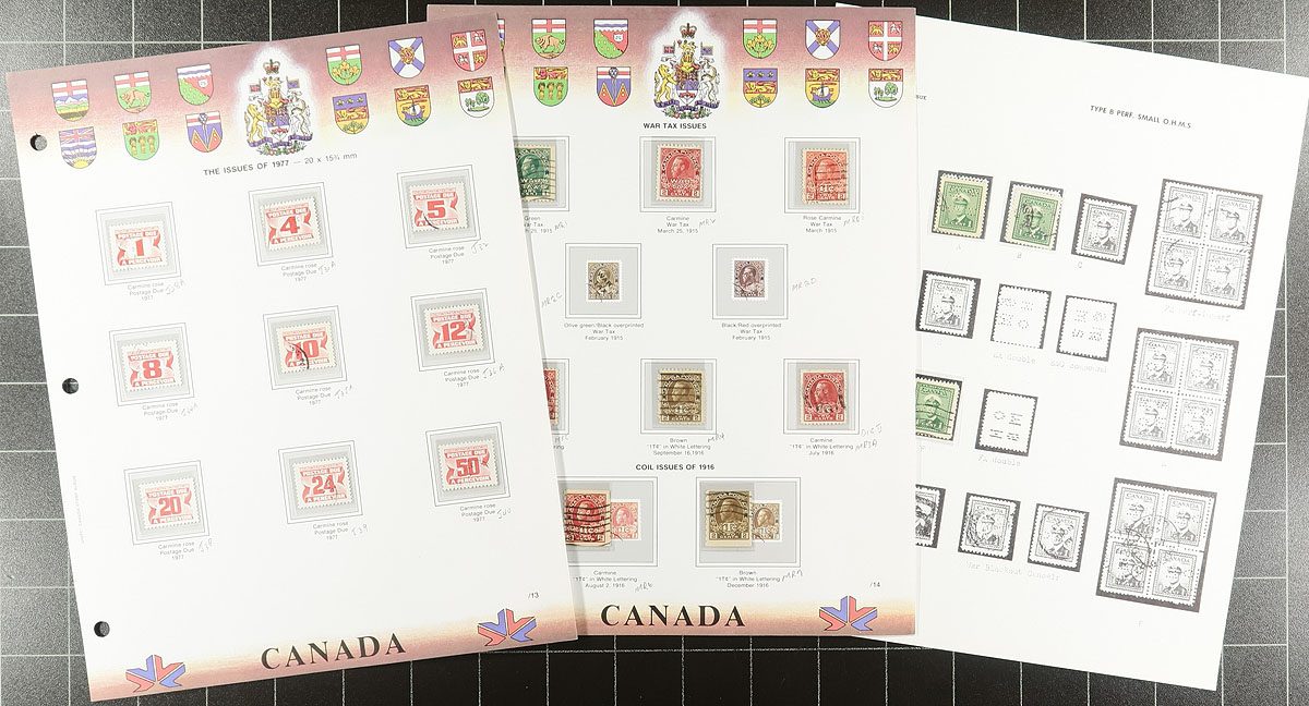A used, and quite complete, collection of used "back of the book" Canada, plus a stamp or two from the three Maritime colonies, plus a collection of about 100 different Newfoundland stamps. Most are clean examples with respectable cancels. Includes all the Montreal Olympic semi-postals, and an example of each of the airmail and special delivery issues. The Registration trio is there, including the 8c #F3, and a basic offering of both purple and red postage dues. The Officials include a light offering of 4-hole OHMS, and a hit-or-miss group of "OHMS" and "G" overprints (did see the $ Peace and $ Fisheries with "G" overprints). Lots of catalogue value here. Estimate =