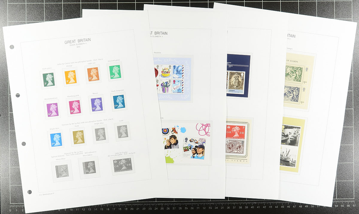 A very recent and quite complete group of mint, never hinged issues from 2006-2013 on hingeless pages in a lovely red padded 1" binder, inscribed "Royal Mail Stamps". All mint, never hinged, with matching souvenir sheets. The Machins do go up to the £5 denomination but are a bit hit or miss, and the collector did not add any of the die-cut booklet singles. There is only a smattering of "Regional" issues. Most of the value is in the 265 different "1st" class rate stamps (there are only a few "2nd", "1st large" and "2nd large" and "Post to Go" issues). We have not counted the face value of the Machins (stamps and souvenir sheets, even though it would have been substantial). Total "usable" face value £687.47 =