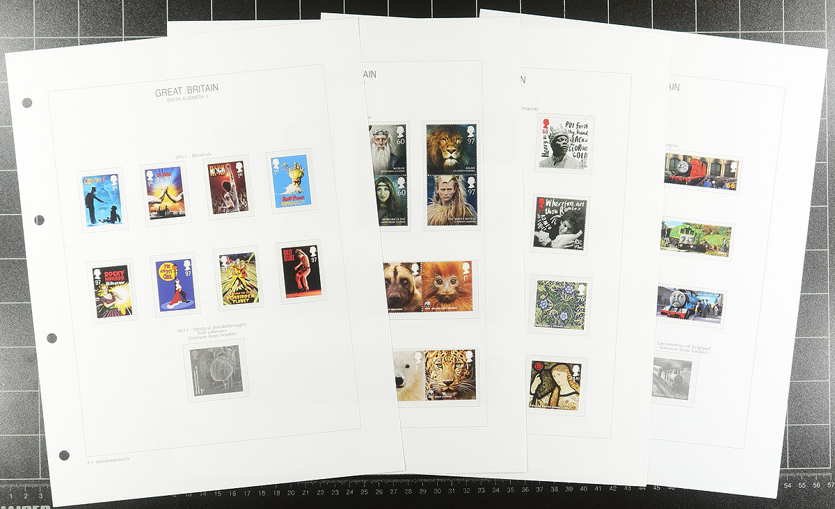 A very recent and quite complete group of mint, never hinged issues from 2006-2013 on hingeless pages in a lovely red padded 1" binder, inscribed "Royal Mail Stamps". All mint, never hinged, with matching souvenir sheets. The Machins do go up to the £5 denomination but are a bit hit or miss, and the collector did not add any of the die-cut booklet singles. There is only a smattering of "Regional" issues. Most of the value is in the 265 different "1st" class rate stamps (there are only a few "2nd", "1st large" and "2nd large" and "Post to Go" issues). We have not counted the face value of the Machins (stamps and souvenir sheets, even though it would have been substantial). Total "usable" face value £687.47 =