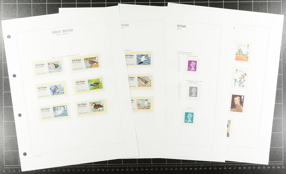 A very recent and quite complete group of mint, never hinged issues from 2006-2013 on hingeless pages in a lovely red padded 1" binder, inscribed "Royal Mail Stamps". All mint, never hinged, with matching souvenir sheets. The Machins do go up to the £5 denomination but are a bit hit or miss, and the collector did not add any of the die-cut booklet singles. There is only a smattering of "Regional" issues. Most of the value is in the 265 different "1st" class rate stamps (there are only a few "2nd", "1st large" and "2nd large" and "Post to Go" issues). We have not counted the face value of the Machins (stamps and souvenir sheets, even though it would have been substantial). Total "usable" face value £687.47 =