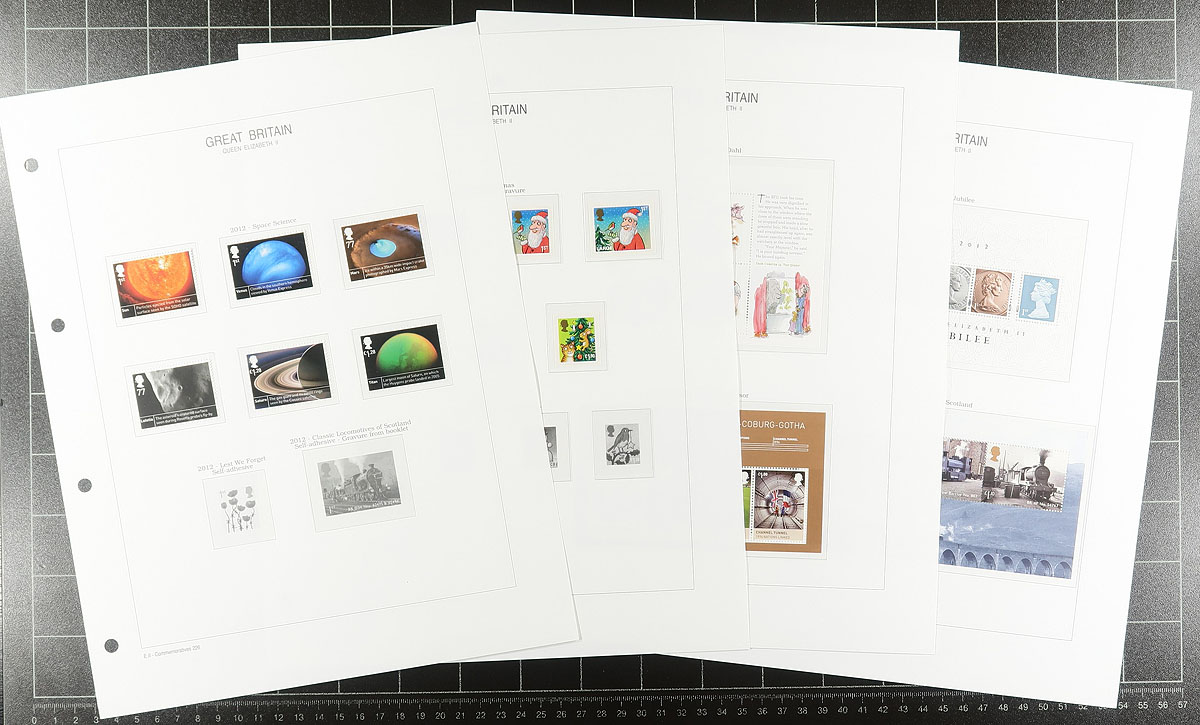 A very recent and quite complete group of mint, never hinged issues from 2006-2013 on hingeless pages in a lovely red padded 1" binder, inscribed "Royal Mail Stamps". All mint, never hinged, with matching souvenir sheets. The Machins do go up to the £5 denomination but are a bit hit or miss, and the collector did not add any of the die-cut booklet singles. There is only a smattering of "Regional" issues. Most of the value is in the 265 different "1st" class rate stamps (there are only a few "2nd", "1st large" and "2nd large" and "Post to Go" issues). We have not counted the face value of the Machins (stamps and souvenir sheets, even though it would have been substantial). Total "usable" face value £687.47 =