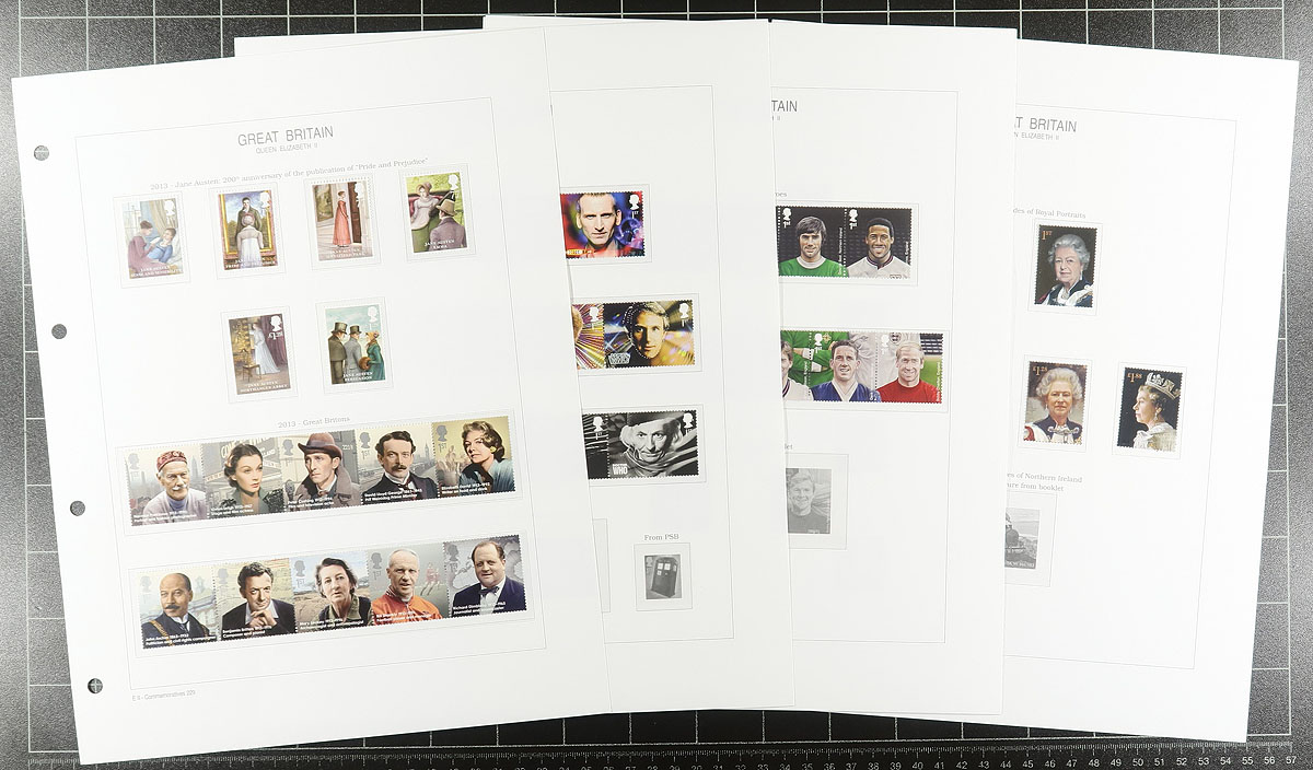A very recent and quite complete group of mint, never hinged issues from 2006-2013 on hingeless pages in a lovely red padded 1" binder, inscribed "Royal Mail Stamps". All mint, never hinged, with matching souvenir sheets. The Machins do go up to the £5 denomination but are a bit hit or miss, and the collector did not add any of the die-cut booklet singles. There is only a smattering of "Regional" issues. Most of the value is in the 265 different "1st" class rate stamps (there are only a few "2nd", "1st large" and "2nd large" and "Post to Go" issues). We have not counted the face value of the Machins (stamps and souvenir sheets, even though it would have been substantial). Total "usable" face value £687.47 =