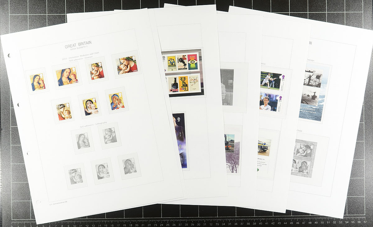 A very recent and quite complete group of mint, never hinged issues from 2006-2013 on hingeless pages in a lovely red padded 1" binder, inscribed "Royal Mail Stamps". All mint, never hinged, with matching souvenir sheets. The Machins do go up to the £5 denomination but are a bit hit or miss, and the collector did not add any of the die-cut booklet singles. There is only a smattering of "Regional" issues. Most of the value is in the 265 different "1st" class rate stamps (there are only a few "2nd", "1st large" and "2nd large" and "Post to Go" issues). We have not counted the face value of the Machins (stamps and souvenir sheets, even though it would have been substantial). Total "usable" face value £687.47 =