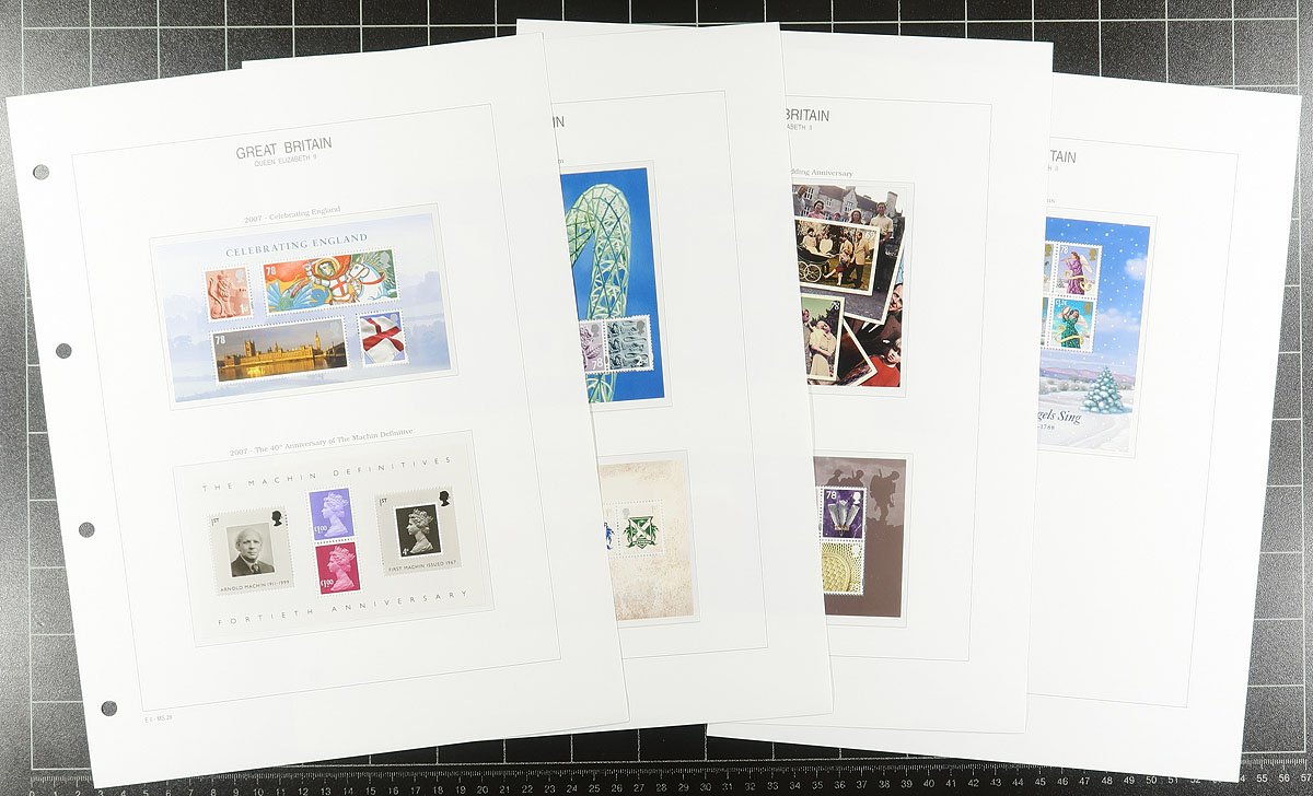 A very recent and quite complete group of mint, never hinged issues from 2006-2013 on hingeless pages in a lovely red padded 1" binder, inscribed "Royal Mail Stamps". All mint, never hinged, with matching souvenir sheets. The Machins do go up to the £5 denomination but are a bit hit or miss, and the collector did not add any of the die-cut booklet singles. There is only a smattering of "Regional" issues. Most of the value is in the 265 different "1st" class rate stamps (there are only a few "2nd", "1st large" and "2nd large" and "Post to Go" issues). We have not counted the face value of the Machins (stamps and souvenir sheets, even though it would have been substantial). Total "usable" face value £687.47 =