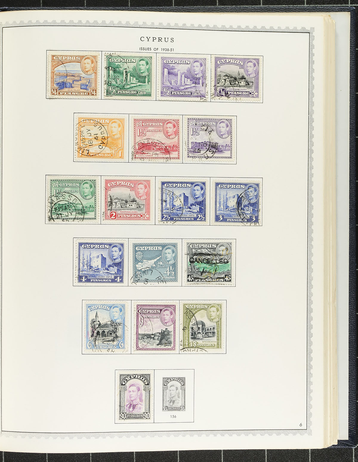 Circa 1973 Minkus "British Europe" album houses a nice, used, collection from several countries. The Great Britain has a good selection of Queen Victoria, with catalogue values to $275.00 and some beautiful cancels. The 5/- KEVII has a perfin and there is solid coverage through to the early 1970''s, with a bit of back of the book and Isles. Cyprus gets going in the King George VI era, but is hit-or-miss throughout, including a few souvenir sheets. Gibraltar is strongest in the 1960's-1970's. There are some overprints on GB stamps for use in the Levant. Malta is strongest from King George VI issues onward. Ireland is mostly 1941-1973 issues. Overall, there is lots of nice material throughout with pockets of better value material. Condition is better than normal. The album has minor wear and after a light clean should be good for another 50 years! Estimate =
