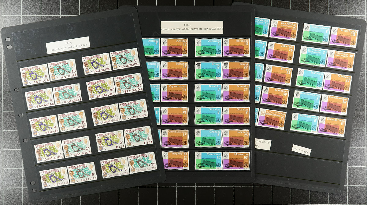 QEII-era "Omnibus" or "Common Design" issues covering the 1953 Coronation to the 1981 Royal Wedding, all mint, mostly lightly hinged on fifty "Hagner" black stock pages. Includes non-standard designs. Sets include Royal Visits, Freedom From Hunger, Red Cross, ITU, ICY, Churchill, World Cup, WHO and more weddings and anniversaries. The black pages retail for over $150.00 and are near new. A bonus is an old "Alligator" stockbook with a selection of 1948 Silver Wedding low values from singles to blocks of 8, most with selvedge, often with plate numbers (this last group not counted in the catalogue value). 2024 Scott US$1258.45 =