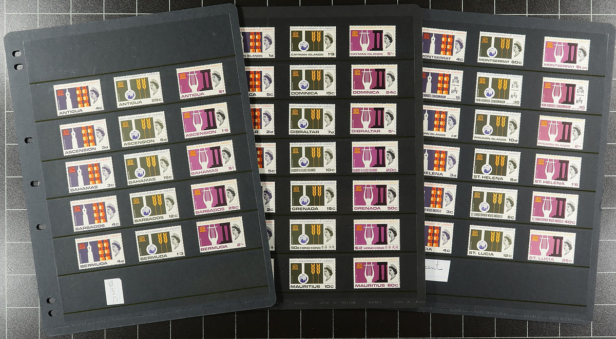 QEII-era "Omnibus" or "Common Design" issues covering the 1953 Coronation to the 1981 Royal Wedding, all mint, mostly lightly hinged on fifty "Hagner" black stock pages. Includes non-standard designs. Sets include Royal Visits, Freedom From Hunger, Red Cross, ITU, ICY, Churchill, World Cup, WHO and more weddings and anniversaries. The black pages retail for over $150.00 and are near new. A bonus is an old "Alligator" stockbook with a selection of 1948 Silver Wedding low values from singles to blocks of 8, most with selvedge, often with plate numbers (this last group not counted in the catalogue value). 2024 Scott US$1258.45 =