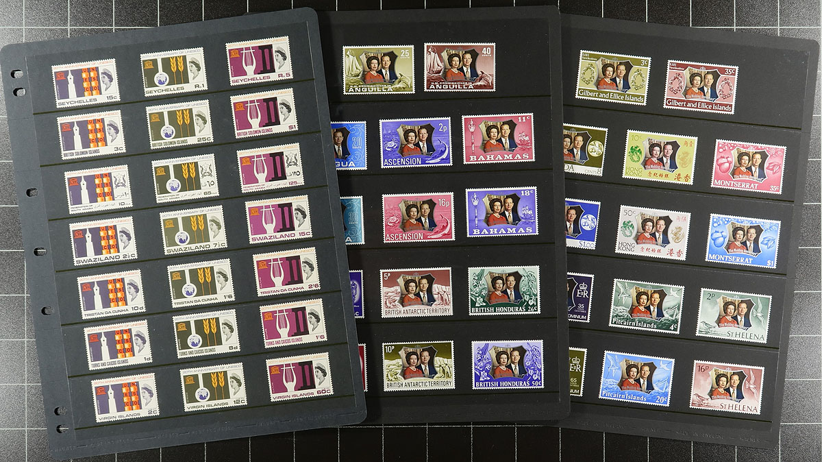 QEII-era "Omnibus" or "Common Design" issues covering the 1953 Coronation to the 1981 Royal Wedding, all mint, mostly lightly hinged on fifty "Hagner" black stock pages. Includes non-standard designs. Sets include Royal Visits, Freedom From Hunger, Red Cross, ITU, ICY, Churchill, World Cup, WHO and more weddings and anniversaries. The black pages retail for over $150.00 and are near new. A bonus is an old "Alligator" stockbook with a selection of 1948 Silver Wedding low values from singles to blocks of 8, most with selvedge, often with plate numbers (this last group not counted in the catalogue value). 2024 Scott US$1258.45 =