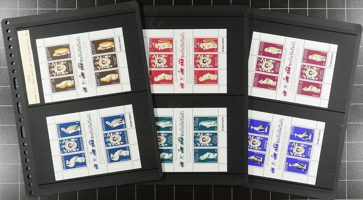 QEII-era "Omnibus" or "Common Design" issues covering the 1953 Coronation to the 1981 Royal Wedding, all mint, mostly lightly hinged on fifty "Hagner" black stock pages. Includes non-standard designs. Sets include Royal Visits, Freedom From Hunger, Red Cross, ITU, ICY, Churchill, World Cup, WHO and more weddings and anniversaries. The black pages retail for over $150.00 and are near new. A bonus is an old "Alligator" stockbook with a selection of 1948 Silver Wedding low values from singles to blocks of 8, most with selvedge, often with plate numbers (this last group not counted in the catalogue value). 2024 Scott US$1258.45 =