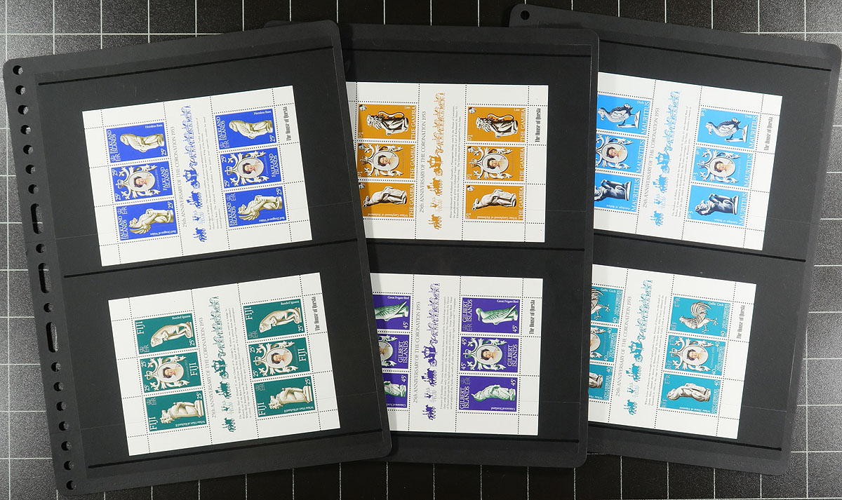 QEII-era "Omnibus" or "Common Design" issues covering the 1953 Coronation to the 1981 Royal Wedding, all mint, mostly lightly hinged on fifty "Hagner" black stock pages. Includes non-standard designs. Sets include Royal Visits, Freedom From Hunger, Red Cross, ITU, ICY, Churchill, World Cup, WHO and more weddings and anniversaries. The black pages retail for over $150.00 and are near new. A bonus is an old "Alligator" stockbook with a selection of 1948 Silver Wedding low values from singles to blocks of 8, most with selvedge, often with plate numbers (this last group not counted in the catalogue value). 2024 Scott US$1258.45 =
