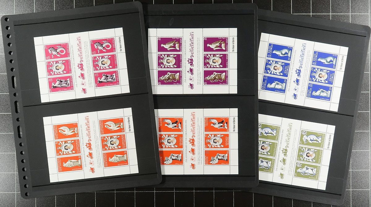 QEII-era "Omnibus" or "Common Design" issues covering the 1953 Coronation to the 1981 Royal Wedding, all mint, mostly lightly hinged on fifty "Hagner" black stock pages. Includes non-standard designs. Sets include Royal Visits, Freedom From Hunger, Red Cross, ITU, ICY, Churchill, World Cup, WHO and more weddings and anniversaries. The black pages retail for over $150.00 and are near new. A bonus is an old "Alligator" stockbook with a selection of 1948 Silver Wedding low values from singles to blocks of 8, most with selvedge, often with plate numbers (this last group not counted in the catalogue value). 2024 Scott US$1258.45 =