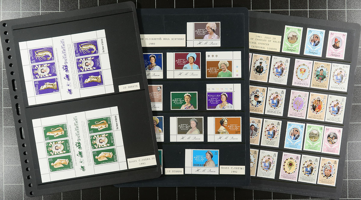 QEII-era "Omnibus" or "Common Design" issues covering the 1953 Coronation to the 1981 Royal Wedding, all mint, mostly lightly hinged on fifty "Hagner" black stock pages. Includes non-standard designs. Sets include Royal Visits, Freedom From Hunger, Red Cross, ITU, ICY, Churchill, World Cup, WHO and more weddings and anniversaries. The black pages retail for over $150.00 and are near new. A bonus is an old "Alligator" stockbook with a selection of 1948 Silver Wedding low values from singles to blocks of 8, most with selvedge, often with plate numbers (this last group not counted in the catalogue value). 2024 Scott US$1258.45 =