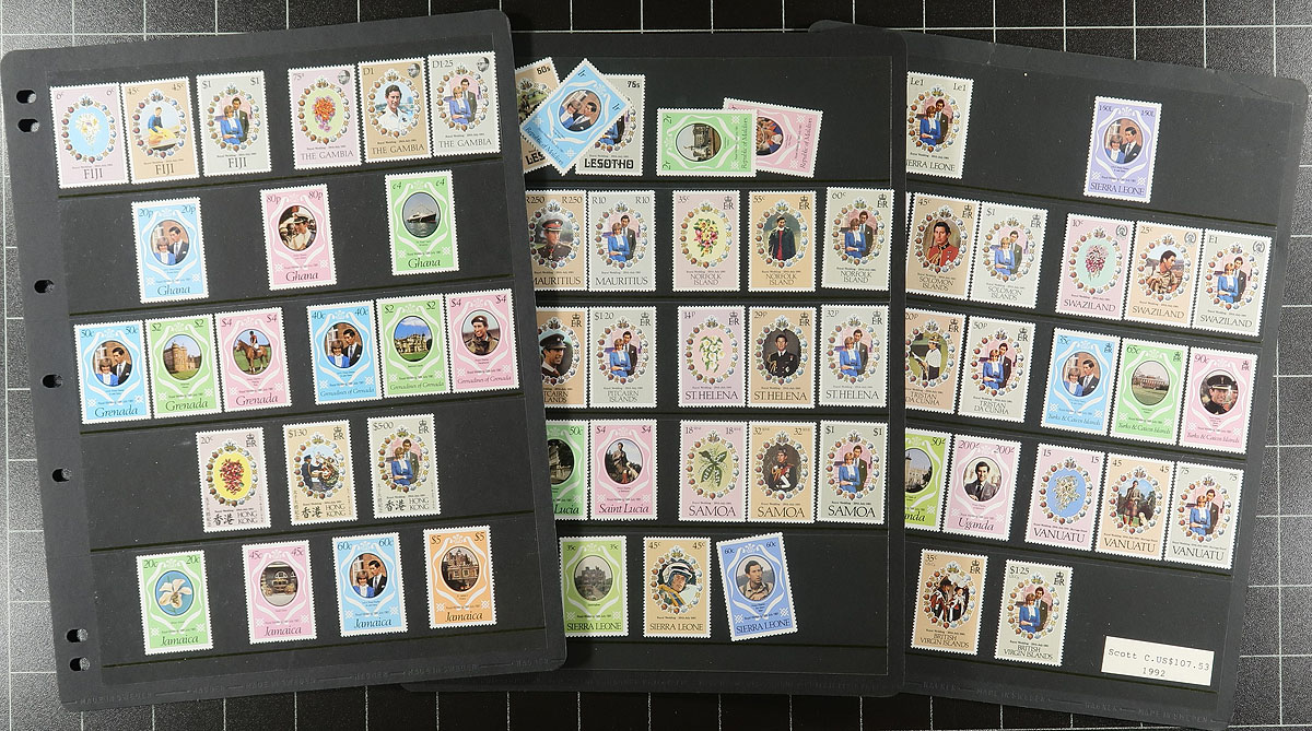 QEII-era "Omnibus" or "Common Design" issues covering the 1953 Coronation to the 1981 Royal Wedding, all mint, mostly lightly hinged on fifty "Hagner" black stock pages. Includes non-standard designs. Sets include Royal Visits, Freedom From Hunger, Red Cross, ITU, ICY, Churchill, World Cup, WHO and more weddings and anniversaries. The black pages retail for over $150.00 and are near new. A bonus is an old "Alligator" stockbook with a selection of 1948 Silver Wedding low values from singles to blocks of 8, most with selvedge, often with plate numbers (this last group not counted in the catalogue value). 2024 Scott US$1258.45 =