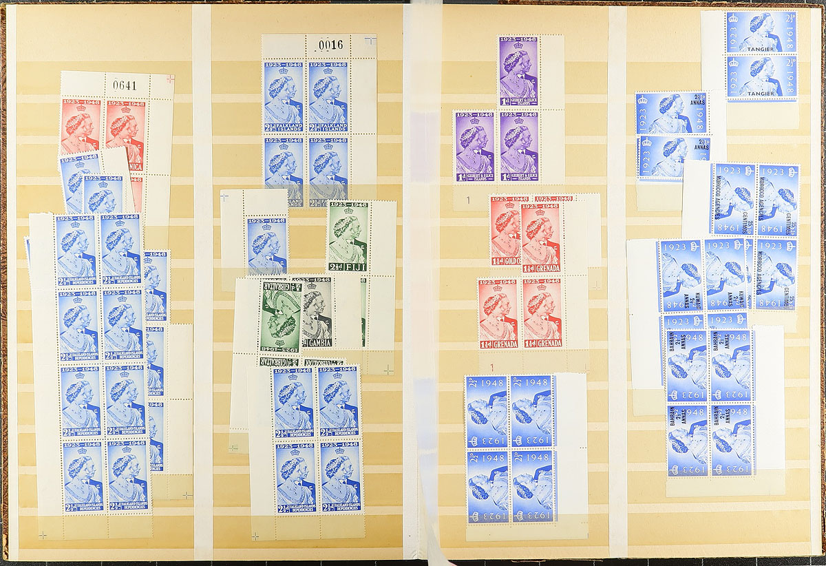 QEII-era "Omnibus" or "Common Design" issues covering the 1953 Coronation to the 1981 Royal Wedding, all mint, mostly lightly hinged on fifty "Hagner" black stock pages. Includes non-standard designs. Sets include Royal Visits, Freedom From Hunger, Red Cross, ITU, ICY, Churchill, World Cup, WHO and more weddings and anniversaries. The black pages retail for over $150.00 and are near new. A bonus is an old "Alligator" stockbook with a selection of 1948 Silver Wedding low values from singles to blocks of 8, most with selvedge, often with plate numbers (this last group not counted in the catalogue value). 2024 Scott US$1258.45 =