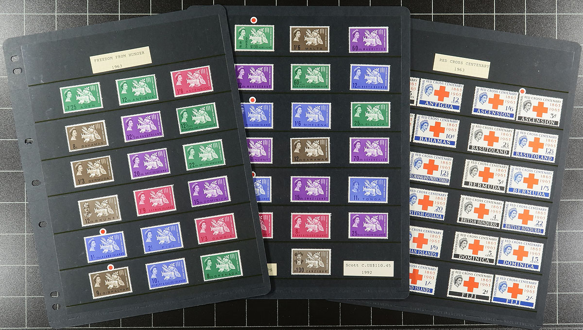 QEII-era "Omnibus" or "Common Design" issues covering the 1953 Coronation to the 1981 Royal Wedding, all mint, mostly lightly hinged on fifty "Hagner" black stock pages. Includes non-standard designs. Sets include Royal Visits, Freedom From Hunger, Red Cross, ITU, ICY, Churchill, World Cup, WHO and more weddings and anniversaries. The black pages retail for over $150.00 and are near new. A bonus is an old "Alligator" stockbook with a selection of 1948 Silver Wedding low values from singles to blocks of 8, most with selvedge, often with plate numbers (this last group not counted in the catalogue value). 2024 Scott US$1258.45 =