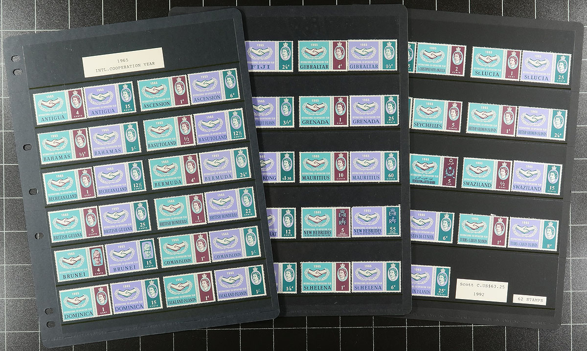 QEII-era "Omnibus" or "Common Design" issues covering the 1953 Coronation to the 1981 Royal Wedding, all mint, mostly lightly hinged on fifty "Hagner" black stock pages. Includes non-standard designs. Sets include Royal Visits, Freedom From Hunger, Red Cross, ITU, ICY, Churchill, World Cup, WHO and more weddings and anniversaries. The black pages retail for over $150.00 and are near new. A bonus is an old "Alligator" stockbook with a selection of 1948 Silver Wedding low values from singles to blocks of 8, most with selvedge, often with plate numbers (this last group not counted in the catalogue value). 2024 Scott US$1258.45 =