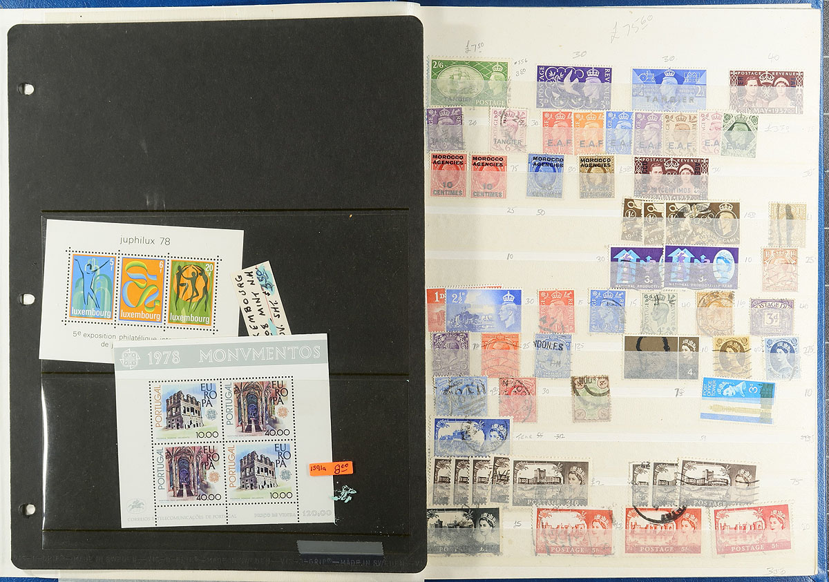 Great Britain, Canada and assorted colonies in a 16-page Uni-Safe stockbook and a binder with a group of souvenir sheets. The best is the QV and KEVII Great Britain, but there is a mix of mostly used material from "the Empire" including items issued into the 1990's. Appears to have been one collector’s duplicates. Many nice cancels and better stamps throughout. A conservative valuation would be US$3000.00 in catalogue value. The perfect lot for any keen collector or dealer, with lots of easily recognizable value. Estimate =