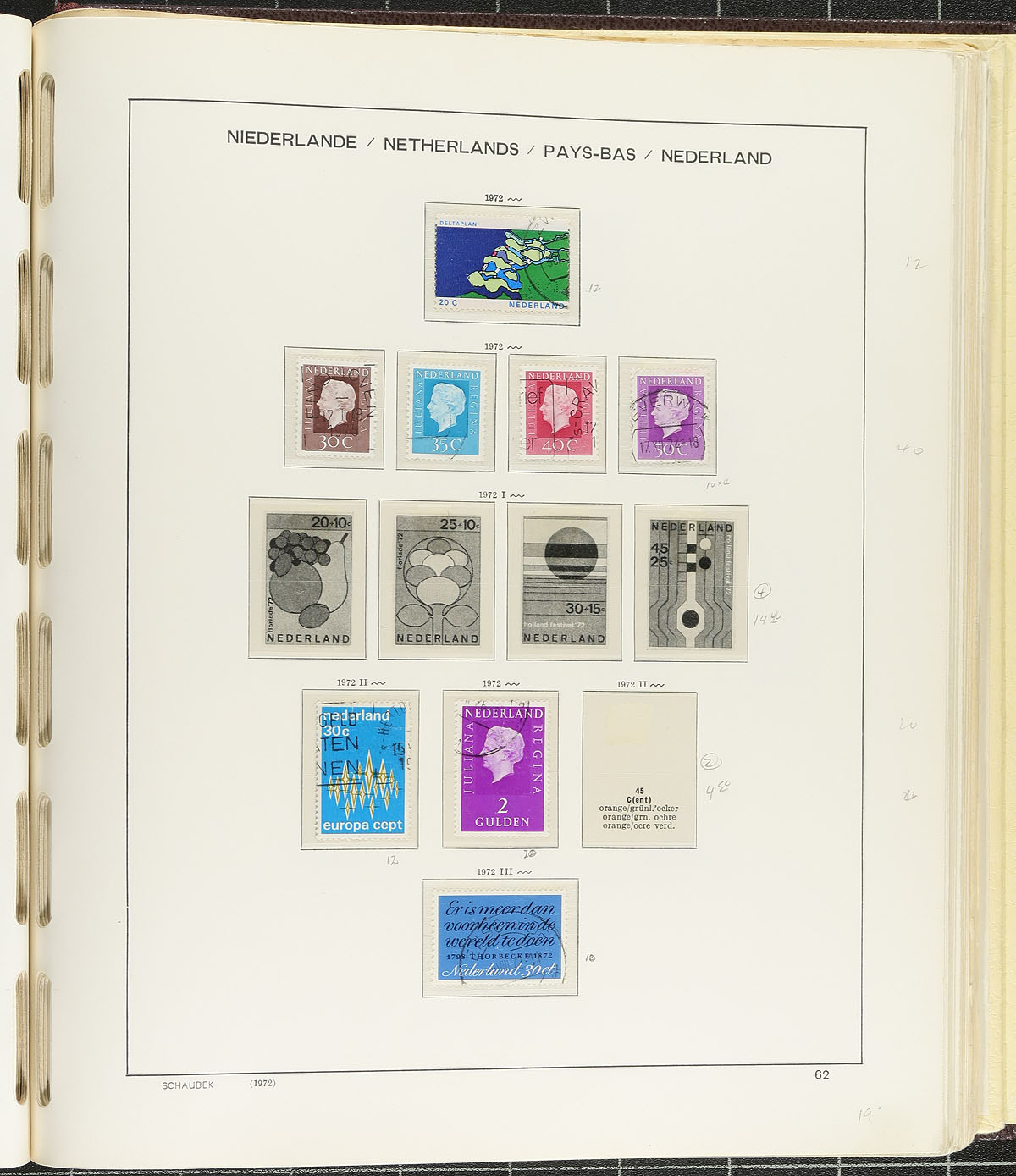 When this Schaubek album was last on the market, it was in a circa 1980 Weeda bidboard (with an owner’s catalogue value of $145.00!). Mostly used, with pages to 1976 and professional looking collector-added clear mounts, this mostly used collection includes a wide range of issues, including some "back of the book", with a number of nice cancels. Better mint #20 and #22 (heavily hinged, cat $475.00) and used #12 (cat $160.00) and #18. Someone attempted to re-catalogue this collection a few years ago and pointed out some faulty stamps. We are going to stick with an estimated value. Estimate =