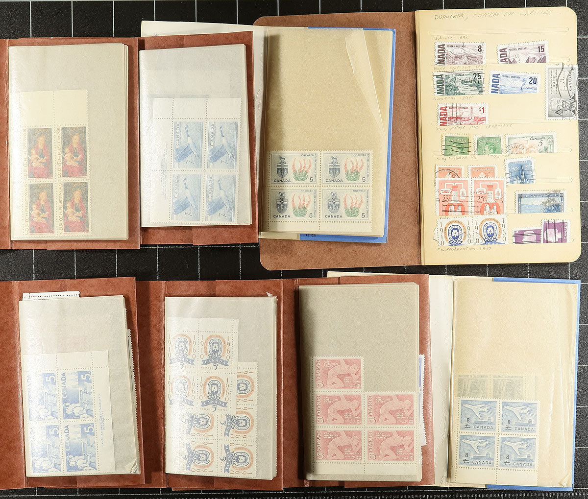 Come for the stamps, stay for the stockbooks. The stamps include a used collection, a mint collection, with a handful of block files (lots of 1950's-1960's blocks, inc $1.00 Export, Centennial) and some plate blocks, a couple of pocket-sized stockbooks, glassines and old bid board lots. With some good coverage, some modern face value, some back of the book, including revenue. The five full-sized stockbooks are either packed or quite sparse, but most are high quality and larger sized, and one of the books has non-Canada material at the end. Value at every turn here, taking up over half of a bankers box. Estimate =