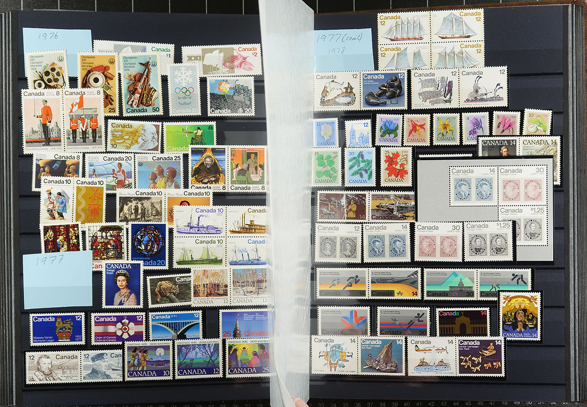 Come for the stamps, stay for the stockbooks. The stamps include a used collection, a mint collection, with a handful of block files (lots of 1950's-1960's blocks, inc $1.00 Export, Centennial) and some plate blocks, a couple of pocket-sized stockbooks, glassines and old bid board lots. With some good coverage, some modern face value, some back of the book, including revenue. The five full-sized stockbooks are either packed or quite sparse, but most are high quality and larger sized, and one of the books has non-Canada material at the end. Value at every turn here, taking up over half of a bankers box. Estimate =