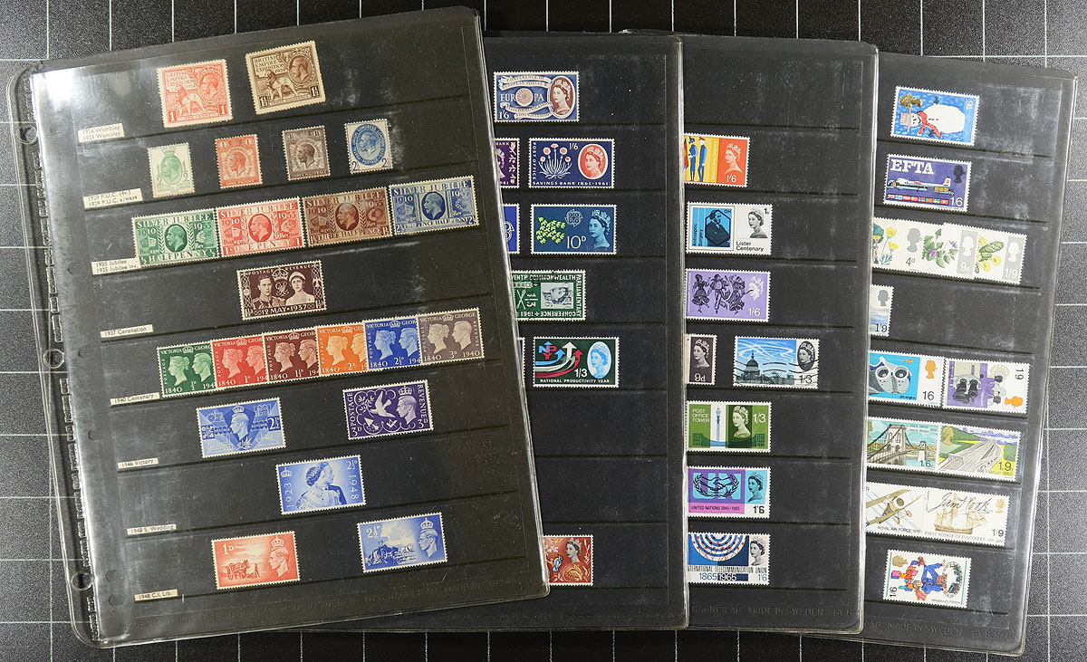 This old-time dealer’s display could just as easily be sold as "supplies with some stamps". The stamps are a mostly mint offering of Great Britain from King George V to 1984, as well as 1970's-1980's Guernsey, Jersey and Isle of Man. Mostly regular issues, with some souvenir sheets, traffic light pairs, a touch of back of the book, and a set of Framas. All priced at the height of speculation on many of these issues. The Hagner pages on which these are mounted are 1-8 pocket and are two to a page protector, which has aged, leaving 108 near-new Hagner pages (these alone retail about $400.00 before any stamps have been added).Throw in a few hundred dollars of catalogue value for the stamps. Estimate =