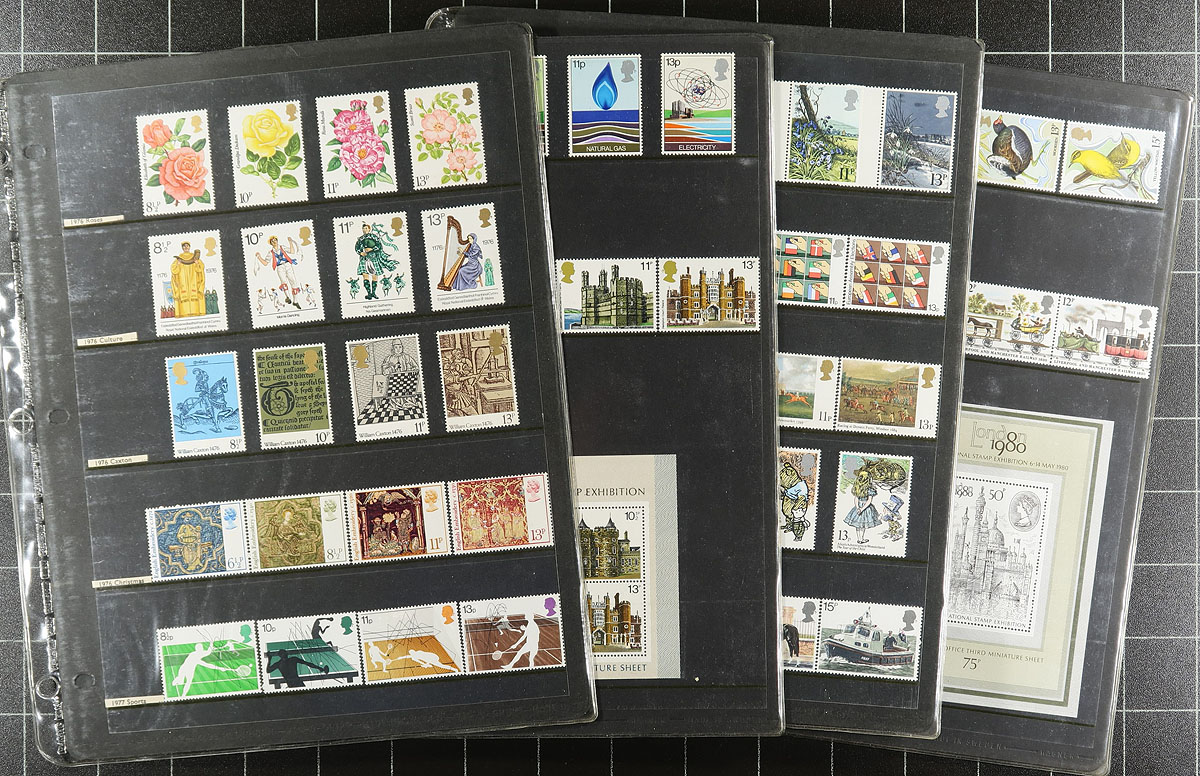 This old-time dealer’s display could just as easily be sold as "supplies with some stamps". The stamps are a mostly mint offering of Great Britain from King George V to 1984, as well as 1970's-1980's Guernsey, Jersey and Isle of Man. Mostly regular issues, with some souvenir sheets, traffic light pairs, a touch of back of the book, and a set of Framas. All priced at the height of speculation on many of these issues. The Hagner pages on which these are mounted are 1-8 pocket and are two to a page protector, which has aged, leaving 108 near-new Hagner pages (these alone retail about $400.00 before any stamps have been added).Throw in a few hundred dollars of catalogue value for the stamps. Estimate =