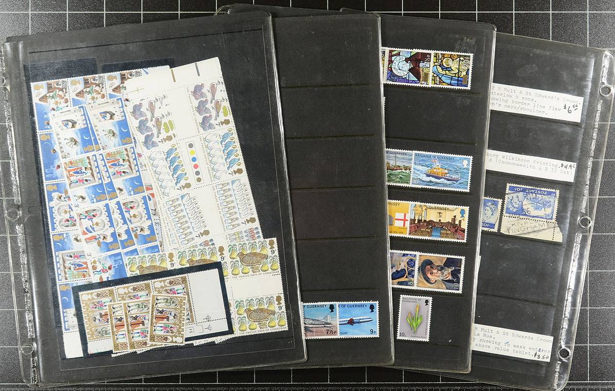 This old-time dealer’s display could just as easily be sold as "supplies with some stamps". The stamps are a mostly mint offering of Great Britain from King George V to 1984, as well as 1970's-1980's Guernsey, Jersey and Isle of Man. Mostly regular issues, with some souvenir sheets, traffic light pairs, a touch of back of the book, and a set of Framas. All priced at the height of speculation on many of these issues. The Hagner pages on which these are mounted are 1-8 pocket and are two to a page protector, which has aged, leaving 108 near-new Hagner pages (these alone retail about $400.00 before any stamps have been added).Throw in a few hundred dollars of catalogue value for the stamps. Estimate =