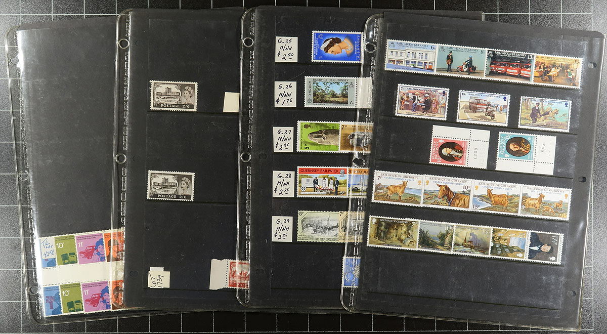 This old-time dealer’s display could just as easily be sold as "supplies with some stamps". The stamps are a mostly mint offering of Great Britain from King George V to 1984, as well as 1970's-1980's Guernsey, Jersey and Isle of Man. Mostly regular issues, with some souvenir sheets, traffic light pairs, a touch of back of the book, and a set of Framas. All priced at the height of speculation on many of these issues. The Hagner pages on which these are mounted are 1-8 pocket and are two to a page protector, which has aged, leaving 108 near-new Hagner pages (these alone retail about $400.00 before any stamps have been added).Throw in a few hundred dollars of catalogue value for the stamps. Estimate =