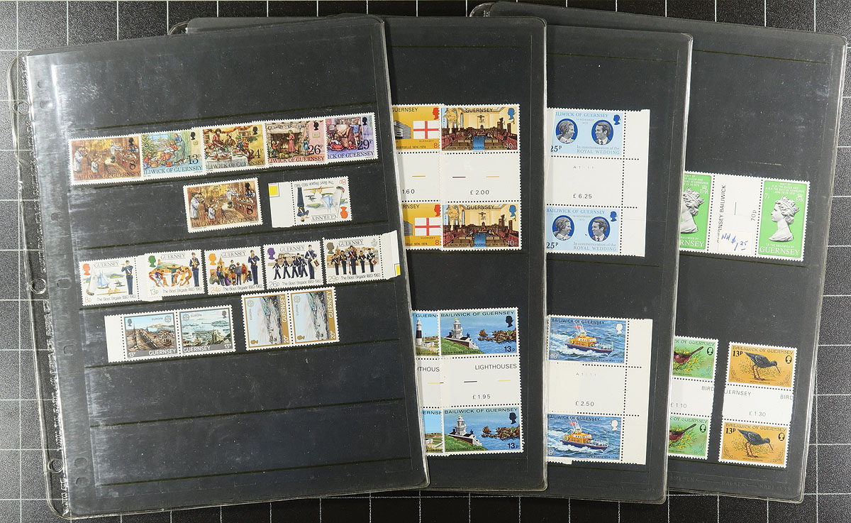 This old-time dealer’s display could just as easily be sold as "supplies with some stamps". The stamps are a mostly mint offering of Great Britain from King George V to 1984, as well as 1970's-1980's Guernsey, Jersey and Isle of Man. Mostly regular issues, with some souvenir sheets, traffic light pairs, a touch of back of the book, and a set of Framas. All priced at the height of speculation on many of these issues. The Hagner pages on which these are mounted are 1-8 pocket and are two to a page protector, which has aged, leaving 108 near-new Hagner pages (these alone retail about $400.00 before any stamps have been added).Throw in a few hundred dollars of catalogue value for the stamps. Estimate =