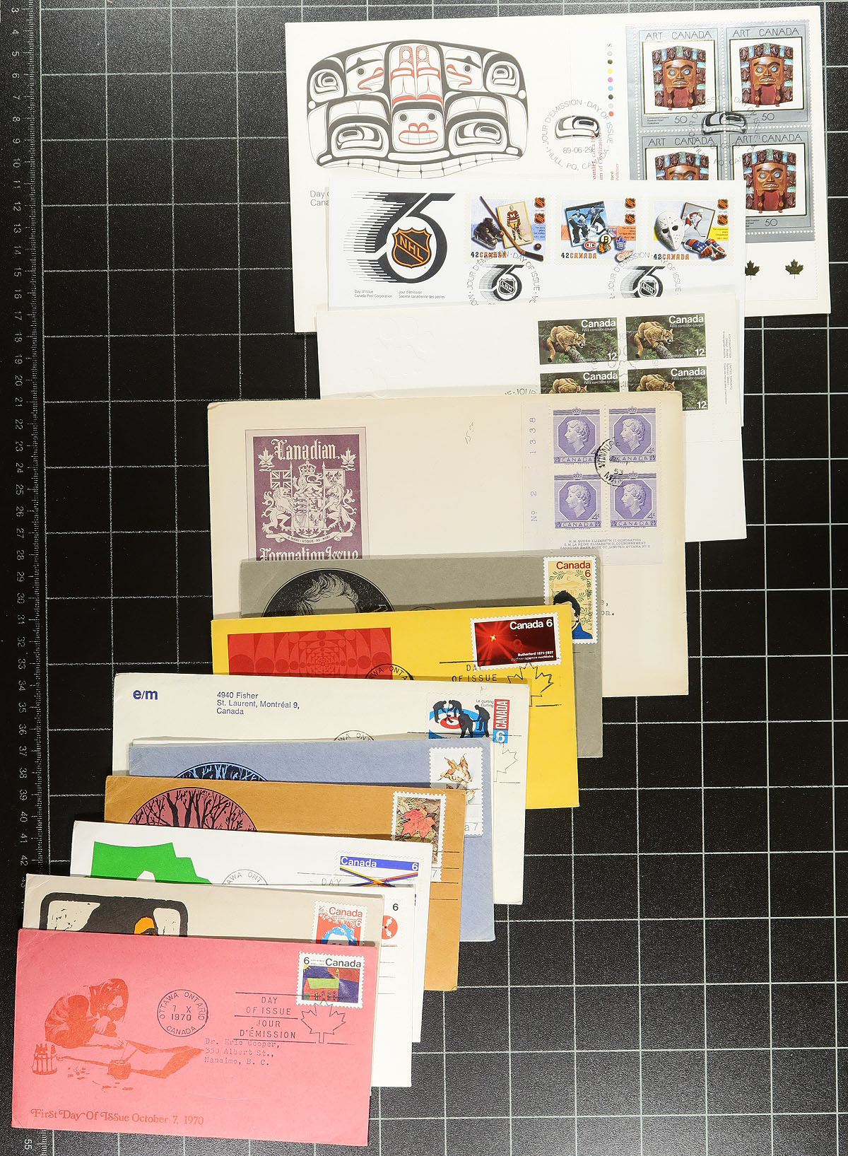 First Day Cover hoard/accumulation, mostly 1939-1984, a mix of private and Canada Post cachets, with many blocks and plate blocks noted. A wide range of private cachet makers, including the drug companies, Rosecraft, (6 different "International Postal Collectors League" foil cachet from 1982-1984, original cost $60.00!) and even a few "one-offs". A mix of #8 and #10 sized covers, with some into the 1970's. The Canada Post cachets are often sorted by year. As material is from different sources, some light duplication should be expected. About 500 covers. Estimate =
