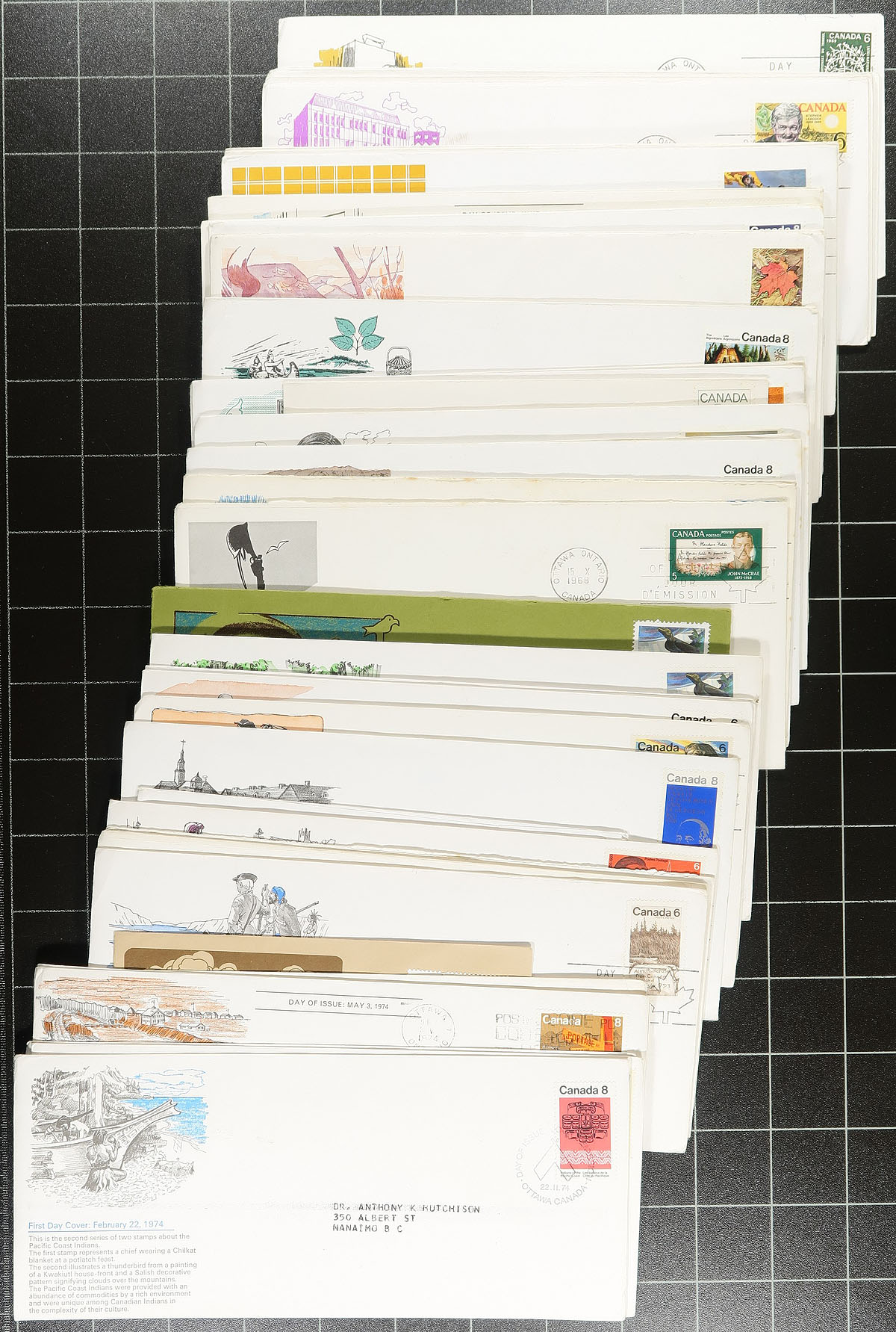 First Day Cover hoard/accumulation, mostly 1939-1984, a mix of private and Canada Post cachets, with many blocks and plate blocks noted. A wide range of private cachet makers, including the drug companies, Rosecraft, (6 different "International Postal Collectors League" foil cachet from 1982-1984, original cost $60.00!) and even a few "one-offs". A mix of #8 and #10 sized covers, with some into the 1970's. The Canada Post cachets are often sorted by year. As material is from different sources, some light duplication should be expected. About 500 covers. Estimate =