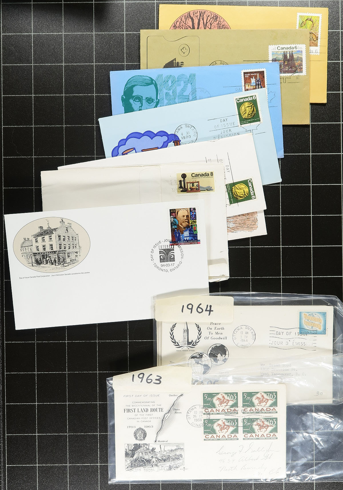 First Day Cover hoard/accumulation, mostly 1939-1984, a mix of private and Canada Post cachets, with many blocks and plate blocks noted. A wide range of private cachet makers, including the drug companies, Rosecraft, (6 different "International Postal Collectors League" foil cachet from 1982-1984, original cost $60.00!) and even a few "one-offs". A mix of #8 and #10 sized covers, with some into the 1970's. The Canada Post cachets are often sorted by year. As material is from different sources, some light duplication should be expected. About 500 covers. Estimate =