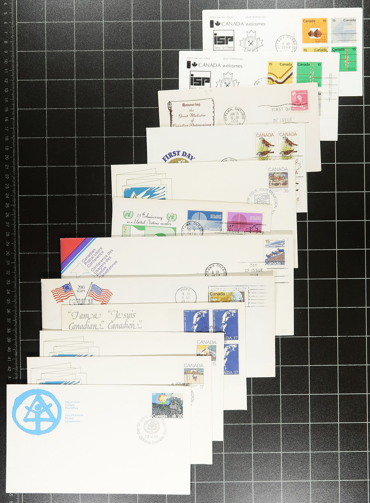 First Day Cover hoard/accumulation, mostly 1939-1984, a mix of private and Canada Post cachets, with many blocks and plate blocks noted. A wide range of private cachet makers, including the drug companies, Rosecraft, (6 different "International Postal Collectors League" foil cachet from 1982-1984, original cost $60.00!) and even a few "one-offs". A mix of #8 and #10 sized covers, with some into the 1970's. The Canada Post cachets are often sorted by year. As material is from different sources, some light duplication should be expected. About 500 covers. Estimate =