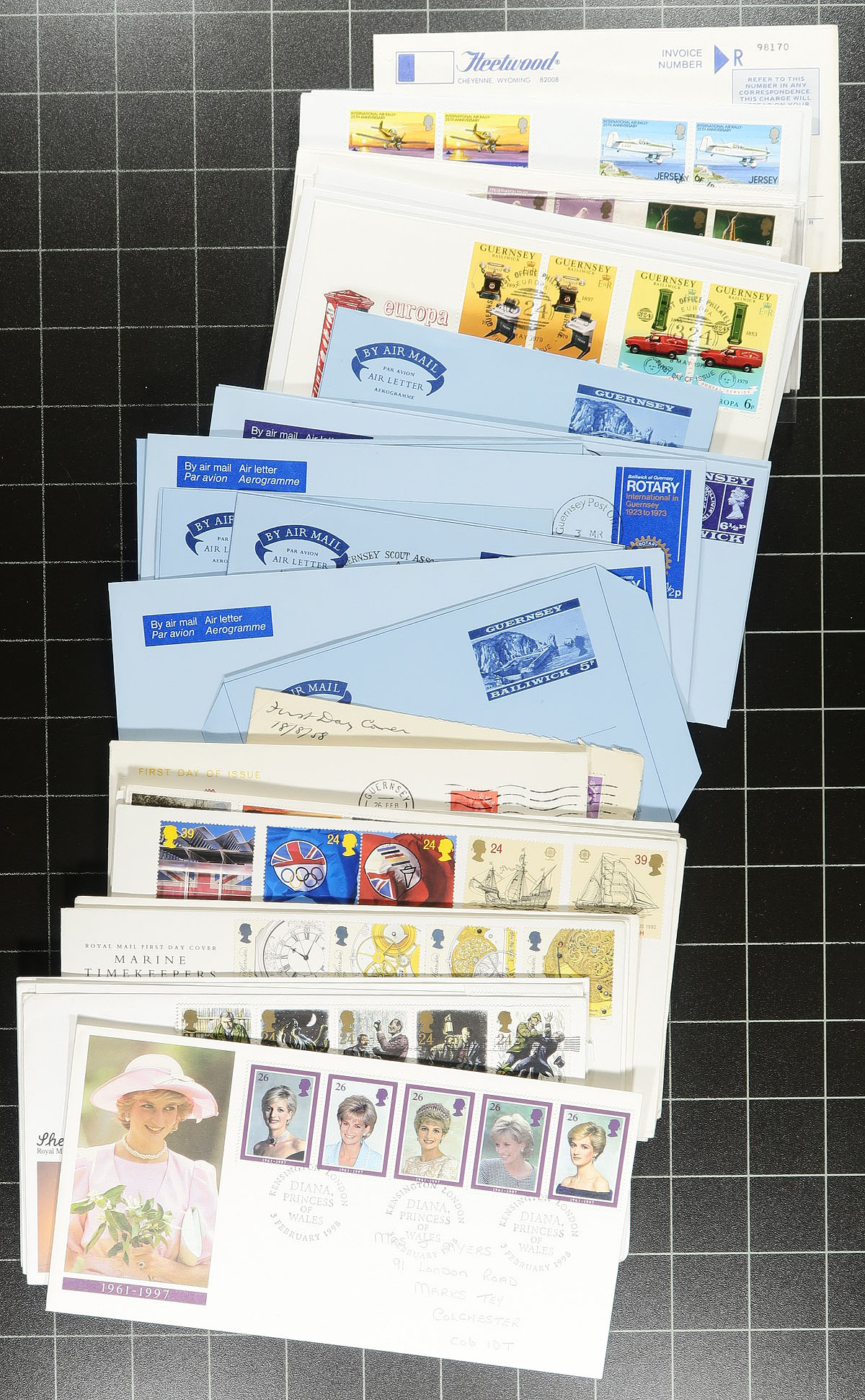 Not your usual British First Day Cover lot. From the 1940's to the 1990's, there is a mix of private and Royal Mail cachets. The Guernsey, Jersey and Isle of Man, are above average with Occupation and 1960's phosphor bands. Catching our eye is a group of 1960's first day covers, a book of 1982-1983 "Fleetwood" cachets and lots of late-century first day covers with outrageous original cost. About 300 FDCs. Perfect for the specialist to dive into. Estimate =