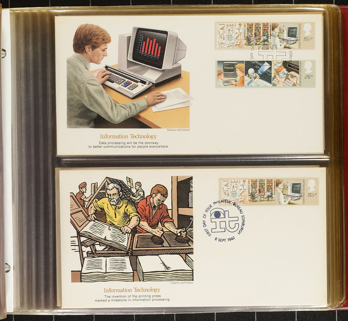 Not your usual British First Day Cover lot. From the 1940's to the 1990's, there is a mix of private and Royal Mail cachets. The Guernsey, Jersey and Isle of Man, are above average with Occupation and 1960's phosphor bands. Catching our eye is a group of 1960's first day covers, a book of 1982-1983 "Fleetwood" cachets and lots of late-century first day covers with outrageous original cost. About 300 FDCs. Perfect for the specialist to dive into. Estimate =
