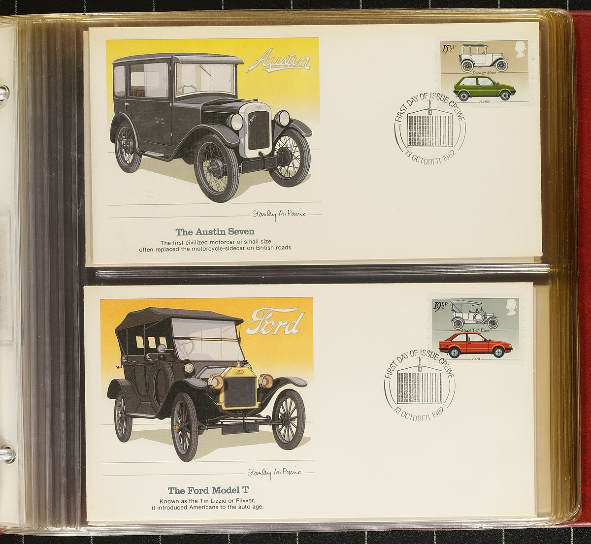 Not your usual British First Day Cover lot. From the 1940's to the 1990's, there is a mix of private and Royal Mail cachets. The Guernsey, Jersey and Isle of Man, are above average with Occupation and 1960's phosphor bands. Catching our eye is a group of 1960's first day covers, a book of 1982-1983 "Fleetwood" cachets and lots of late-century first day covers with outrageous original cost. About 300 FDCs. Perfect for the specialist to dive into. Estimate =