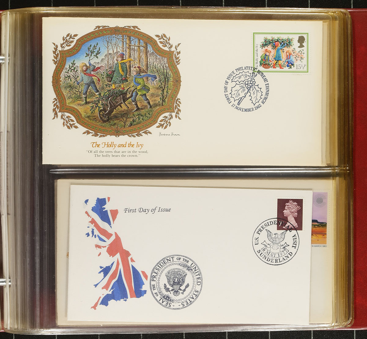 Not your usual British First Day Cover lot. From the 1940's to the 1990's, there is a mix of private and Royal Mail cachets. The Guernsey, Jersey and Isle of Man, are above average with Occupation and 1960's phosphor bands. Catching our eye is a group of 1960's first day covers, a book of 1982-1983 "Fleetwood" cachets and lots of late-century first day covers with outrageous original cost. About 300 FDCs. Perfect for the specialist to dive into. Estimate =
