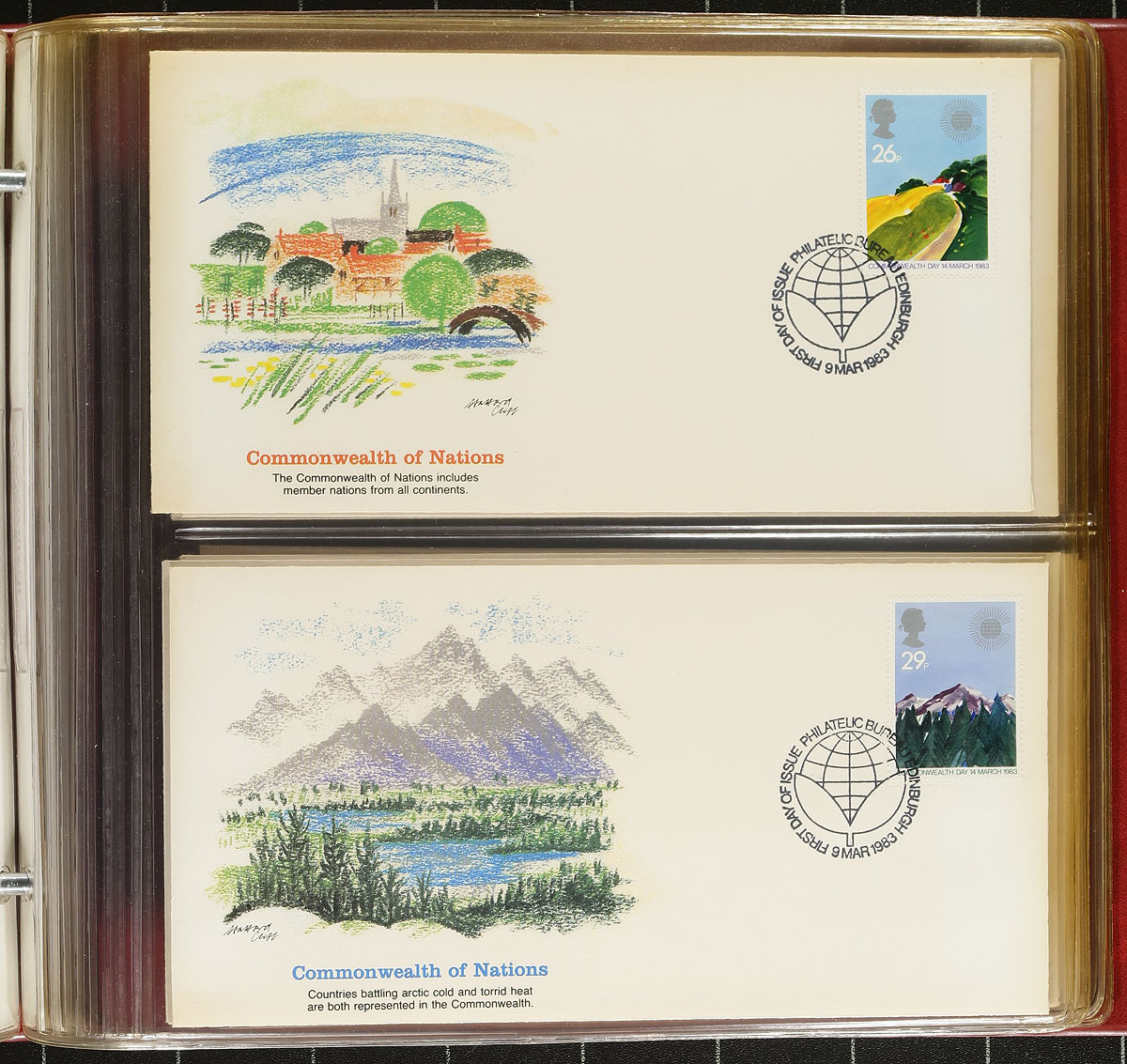 Not your usual British First Day Cover lot. From the 1940's to the 1990's, there is a mix of private and Royal Mail cachets. The Guernsey, Jersey and Isle of Man, are above average with Occupation and 1960's phosphor bands. Catching our eye is a group of 1960's first day covers, a book of 1982-1983 "Fleetwood" cachets and lots of late-century first day covers with outrageous original cost. About 300 FDCs. Perfect for the specialist to dive into. Estimate =