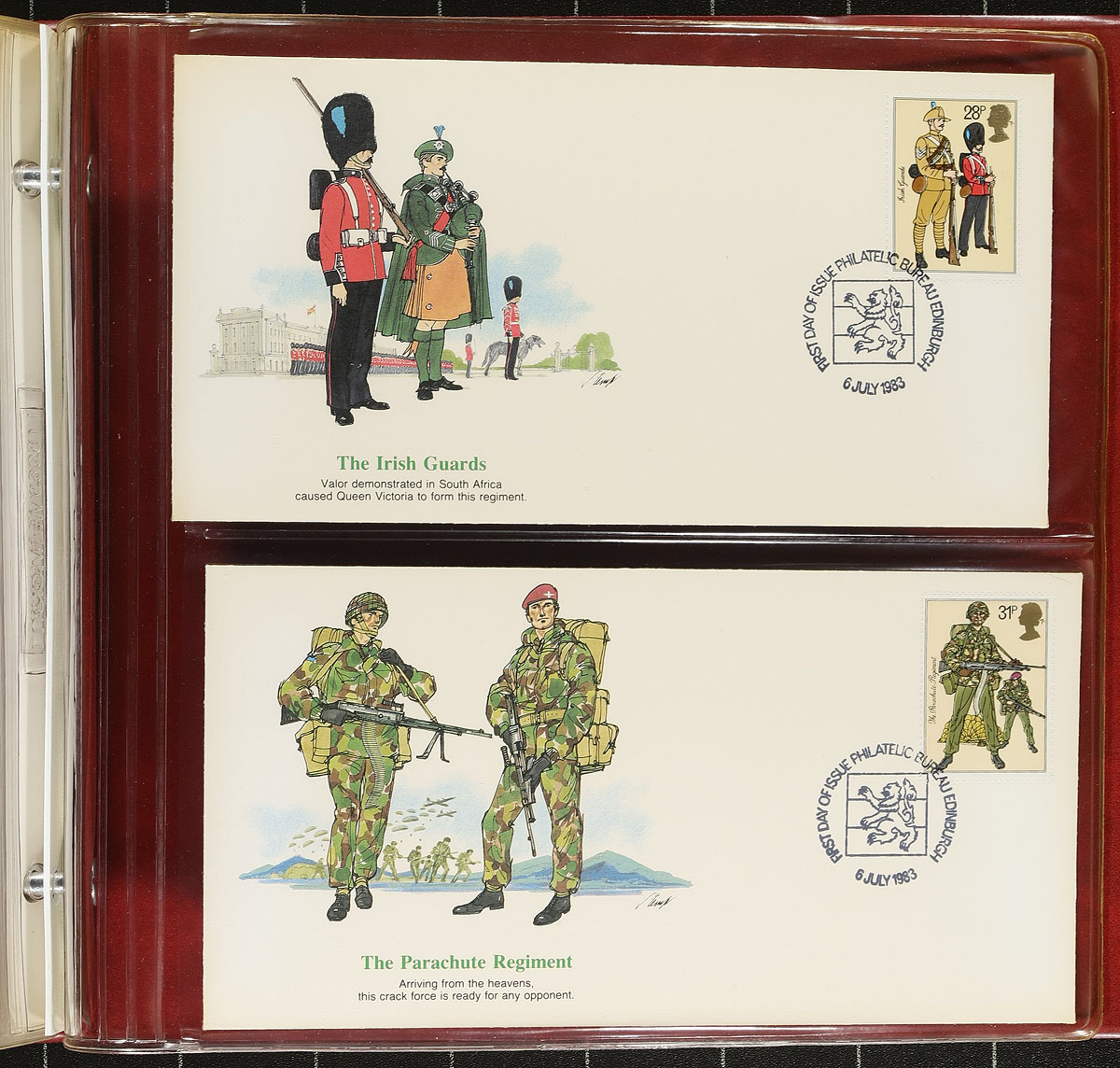 Not your usual British First Day Cover lot. From the 1940's to the 1990's, there is a mix of private and Royal Mail cachets. The Guernsey, Jersey and Isle of Man, are above average with Occupation and 1960's phosphor bands. Catching our eye is a group of 1960's first day covers, a book of 1982-1983 "Fleetwood" cachets and lots of late-century first day covers with outrageous original cost. About 300 FDCs. Perfect for the specialist to dive into. Estimate =