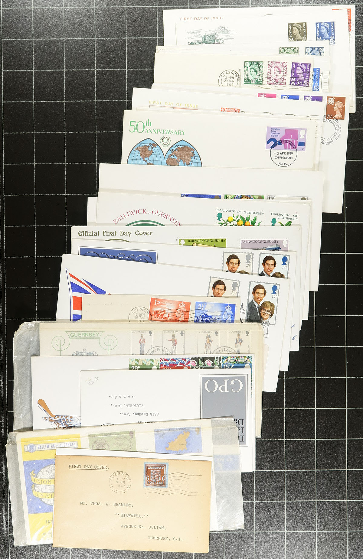 Not your usual British First Day Cover lot. From the 1940's to the 1990's, there is a mix of private and Royal Mail cachets. The Guernsey, Jersey and Isle of Man, are above average with Occupation and 1960's phosphor bands. Catching our eye is a group of 1960's first day covers, a book of 1982-1983 "Fleetwood" cachets and lots of late-century first day covers with outrageous original cost. About 300 FDCs. Perfect for the specialist to dive into. Estimate =