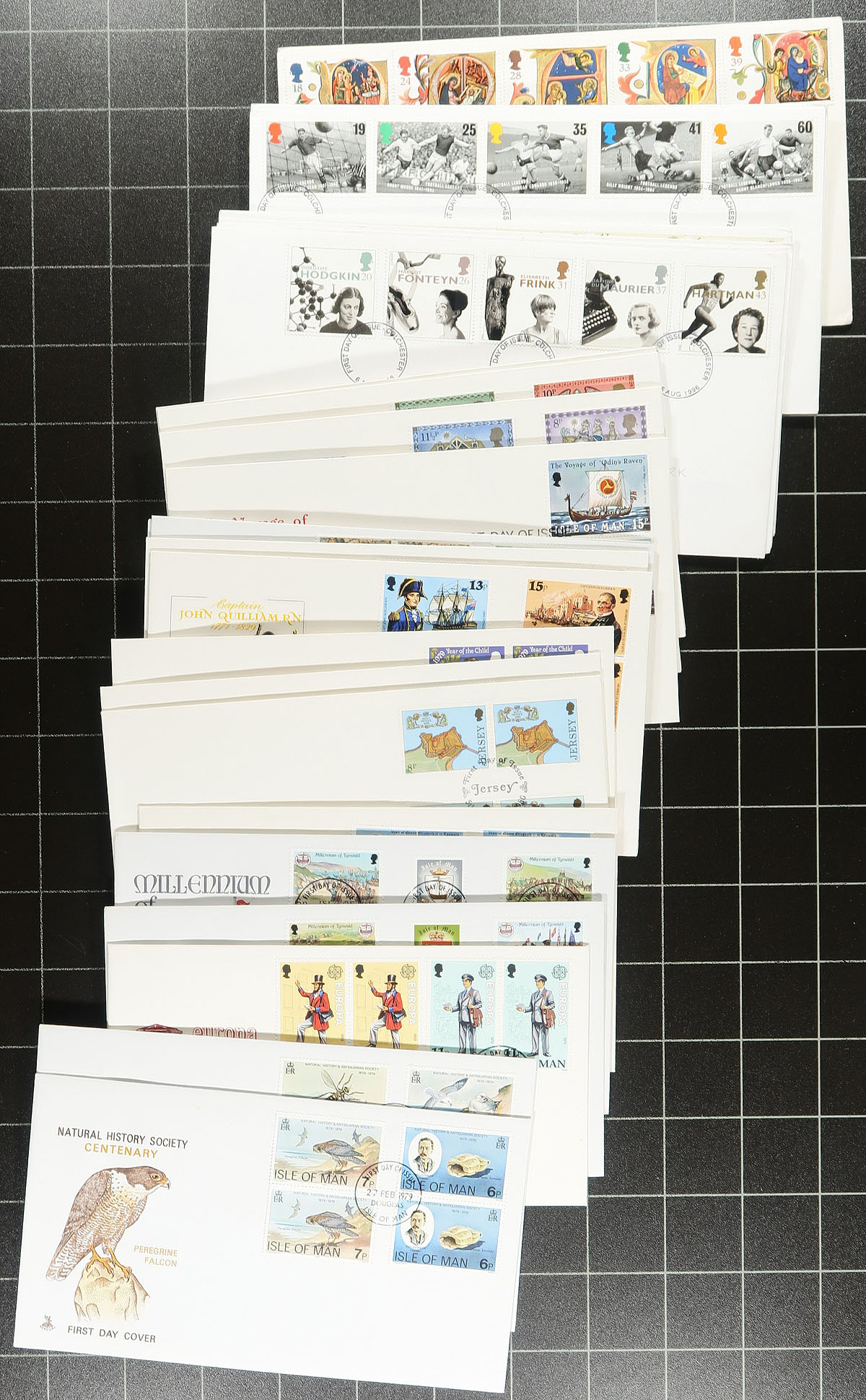 Not your usual British First Day Cover lot. From the 1940's to the 1990's, there is a mix of private and Royal Mail cachets. The Guernsey, Jersey and Isle of Man, are above average with Occupation and 1960's phosphor bands. Catching our eye is a group of 1960's first day covers, a book of 1982-1983 "Fleetwood" cachets and lots of late-century first day covers with outrageous original cost. About 300 FDCs. Perfect for the specialist to dive into. Estimate =