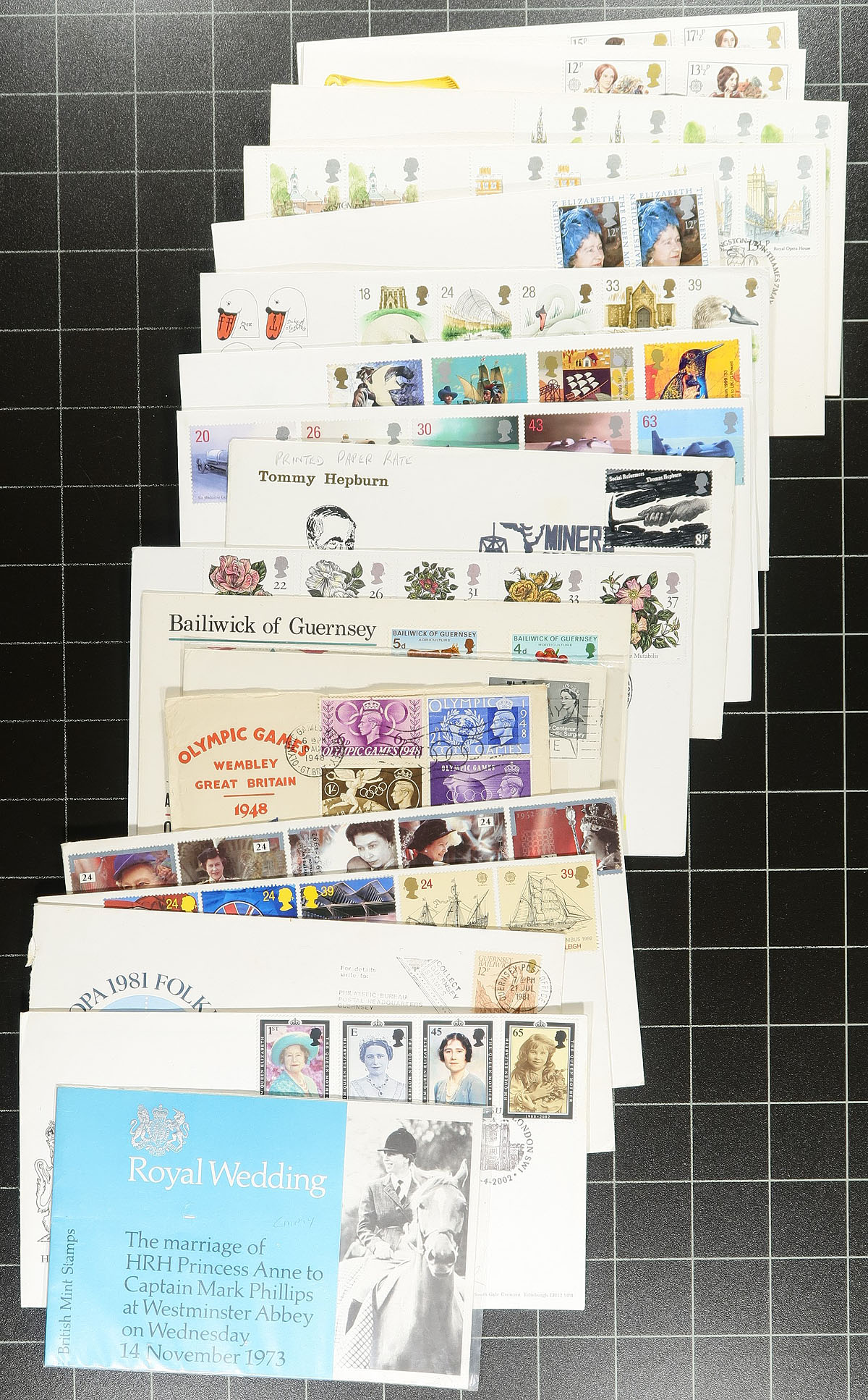 Not your usual British First Day Cover lot. From the 1940's to the 1990's, there is a mix of private and Royal Mail cachets. The Guernsey, Jersey and Isle of Man, are above average with Occupation and 1960's phosphor bands. Catching our eye is a group of 1960's first day covers, a book of 1982-1983 "Fleetwood" cachets and lots of late-century first day covers with outrageous original cost. About 300 FDCs. Perfect for the specialist to dive into. Estimate =