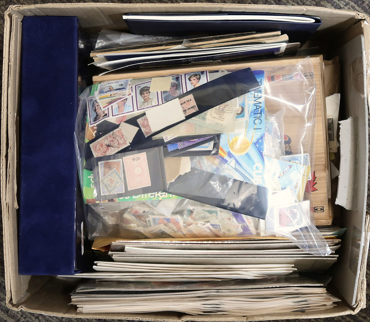Estate Part 3. A clear out of a chaotic estate. "Treasure and Trash" filling a banker’s box. Dealer’s pages, glassines, collection fragments, loose stamps, presentation packs, and who knows what else. This collector amassed a wide range of material and this box is the end of this consignment. Every handful with something new and interesting, from many different countries. Some of this you will deal with quickly, some will need some attention. Perfect for a winter weeks worth of evenings! Estimate =