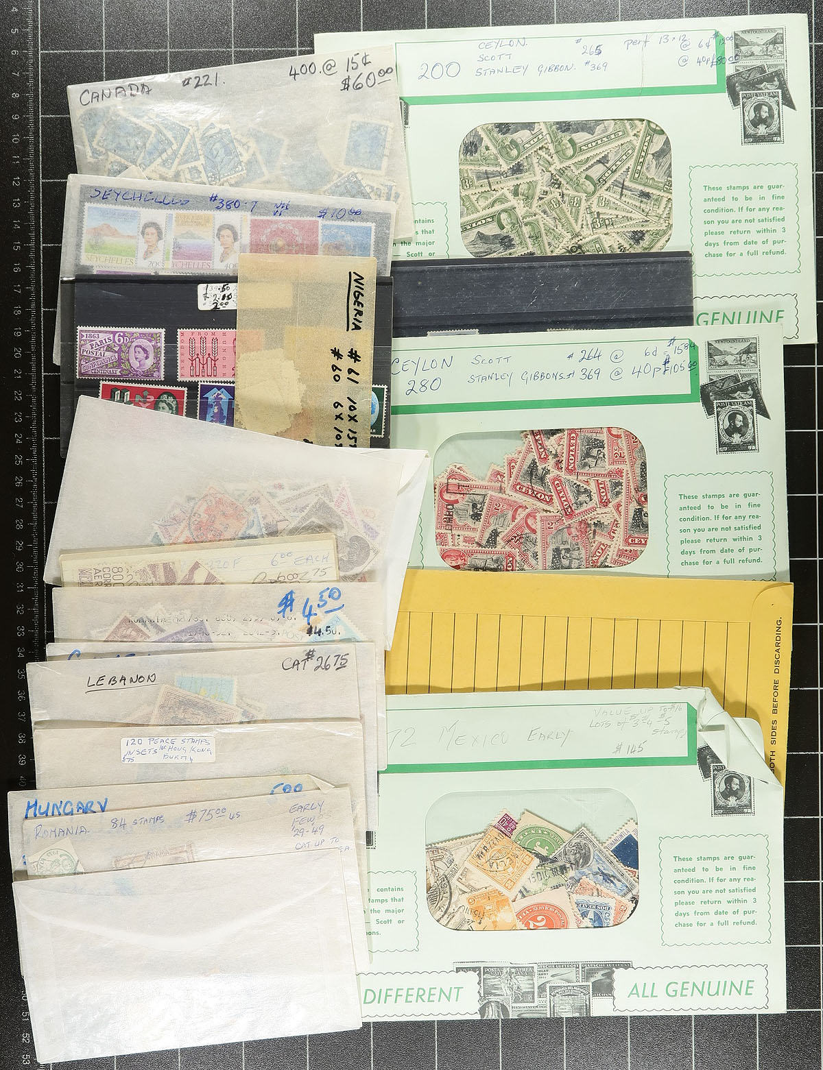 Estate Part 3. A clear out of a chaotic estate. "Treasure and Trash" filling a banker’s box. Dealer’s pages, glassines, collection fragments, loose stamps, presentation packs, and who knows what else. This collector amassed a wide range of material and this box is the end of this consignment. Every handful with something new and interesting, from many different countries. Some of this you will deal with quickly, some will need some attention. Perfect for a winter weeks worth of evenings! Estimate =