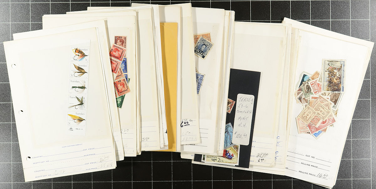 Estate Part 3. A clear out of a chaotic estate. "Treasure and Trash" filling a banker’s box. Dealer’s pages, glassines, collection fragments, loose stamps, presentation packs, and who knows what else. This collector amassed a wide range of material and this box is the end of this consignment. Every handful with something new and interesting, from many different countries. Some of this you will deal with quickly, some will need some attention. Perfect for a winter weeks worth of evenings! Estimate =