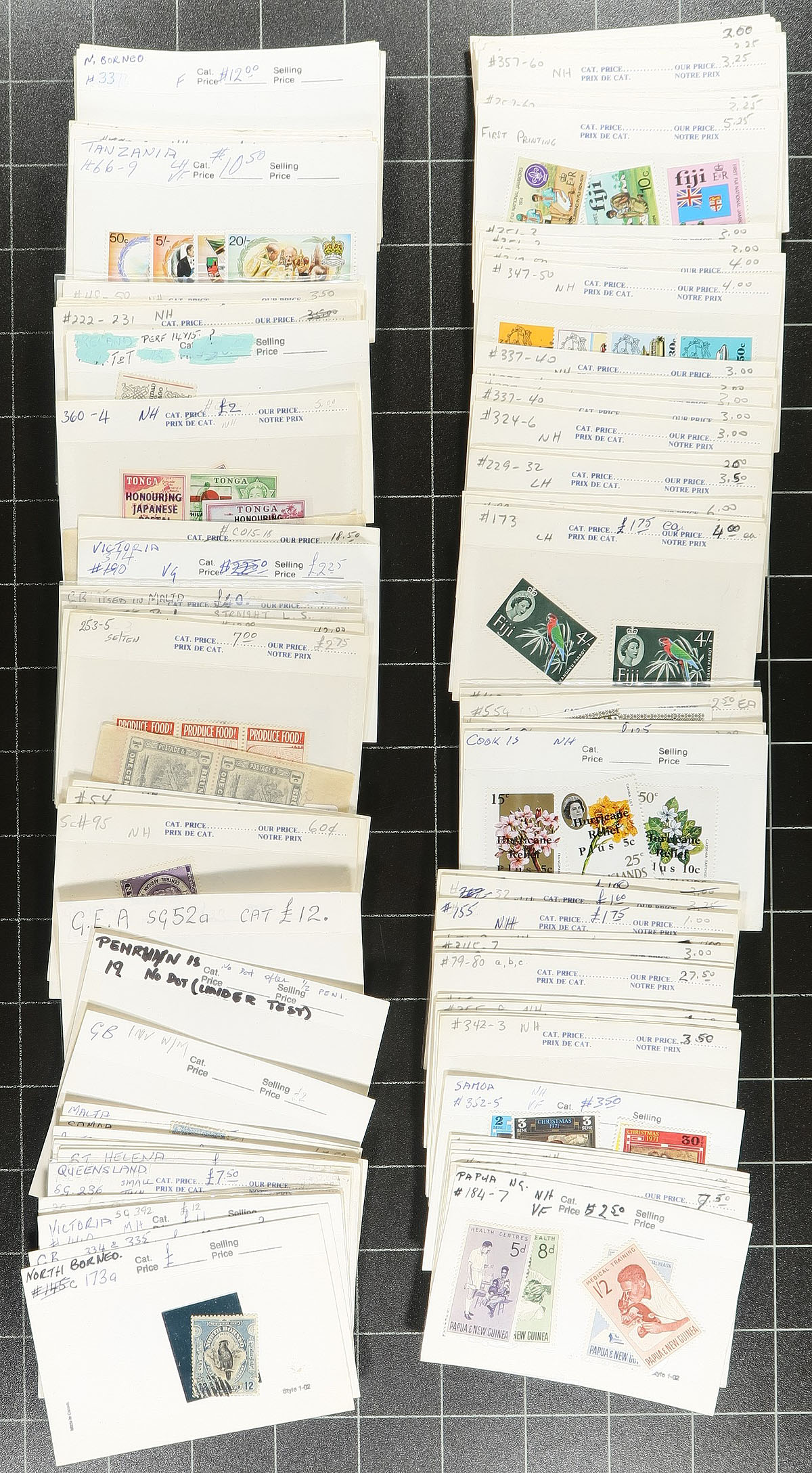 Philatelic lottery ticket lot. A bankers box, filled with the contents of a local estate. Part of it is a conventional "leftovers" box with some album pages, and two red boxes filled with near new "102" cards (each with stamps, heavy in Latin America, Hungary and Australia), the supplies value alone is about $100.00. What makes it a lottery is three smaller boxes filled with one person’s random purchases over a lifetime, heavy in the British Colonies, but with many other countries included. We noted lots of 1935 Silver Jubilees, some early GB and colonial material, with some optimistically identified, and others that will have you scrambling for your reference material. A few hundred items here, many are on black display cards. Diamonds in the rough, here? Estimate =
