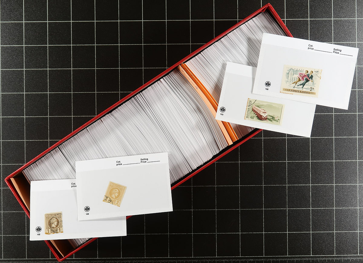 Philatelic lottery ticket lot. A bankers box, filled with the contents of a local estate. Part of it is a conventional "leftovers" box with some album pages, and two red boxes filled with near new "102" cards (each with stamps, heavy in Latin America, Hungary and Australia), the supplies value alone is about $100.00. What makes it a lottery is three smaller boxes filled with one person’s random purchases over a lifetime, heavy in the British Colonies, but with many other countries included. We noted lots of 1935 Silver Jubilees, some early GB and colonial material, with some optimistically identified, and others that will have you scrambling for your reference material. A few hundred items here, many are on black display cards. Diamonds in the rough, here? Estimate =