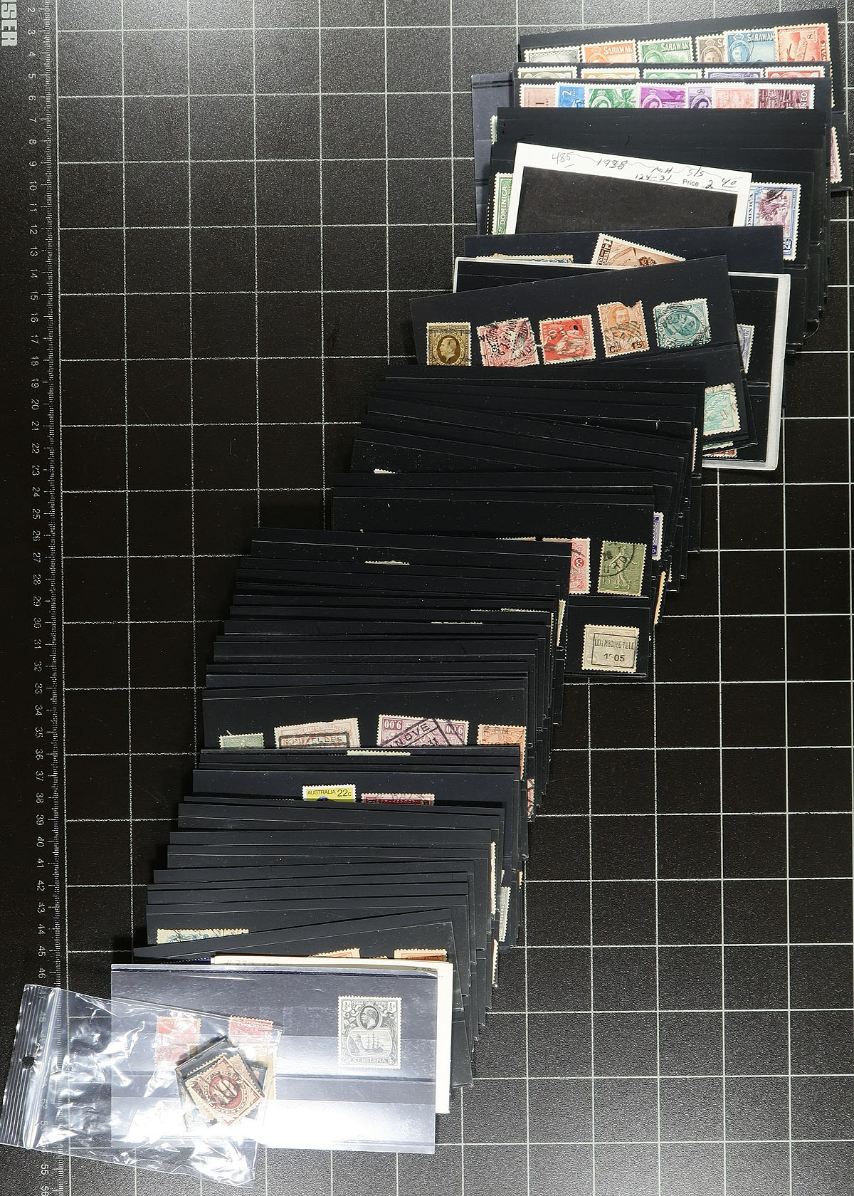 Philatelic lottery ticket lot. A bankers box, filled with the contents of a local estate. Part of it is a conventional "leftovers" box with some album pages, and two red boxes filled with near new "102" cards (each with stamps, heavy in Latin America, Hungary and Australia), the supplies value alone is about $100.00. What makes it a lottery is three smaller boxes filled with one person’s random purchases over a lifetime, heavy in the British Colonies, but with many other countries included. We noted lots of 1935 Silver Jubilees, some early GB and colonial material, with some optimistically identified, and others that will have you scrambling for your reference material. A few hundred items here, many are on black display cards. Diamonds in the rough, here? Estimate =