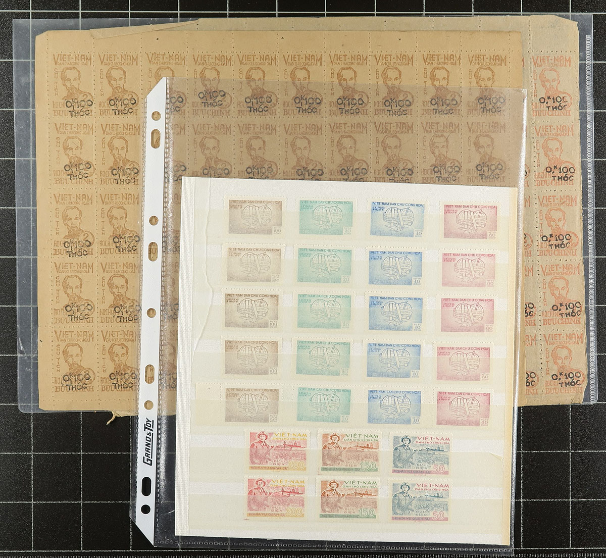 Forgery or reprint? We will let you decide. The key piece is a pair of panes of 50 of the 1955 official overprinted #O6-O7, which catalogue at US$400.00 per pair (of singles), total catalogue value $20.000!. Plus, there is some other similar material which has a better chance of being original, with a bit of duplication (these catalogue $247.50). Mixed condition, from the early-ish days of the Vietnam war. From an estate of a collector who would have had access to buying these stamps long before they say a large rise in catalogue value. Sold as-is. Estimate =